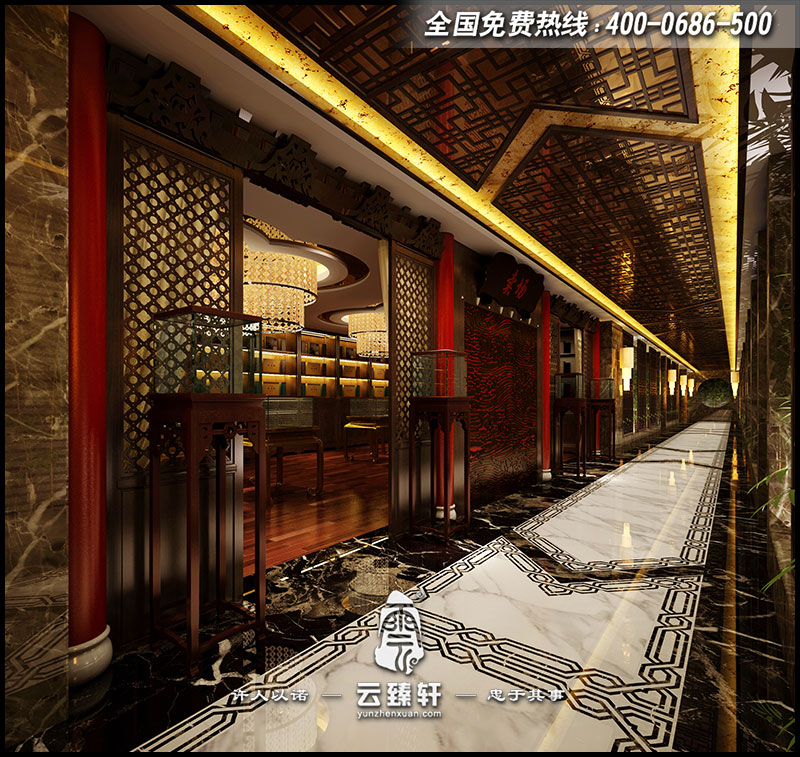 茶莊中式會所展廳入口,以中國傳統(tǒng)建筑經典元素——紅柱、古門、雕檐、匾額等景觀鋪敘,來實現茶道文化對環(huán)境極致追求的空間表達